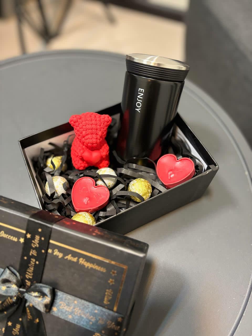 ابن باکس شامل: تراول ماگ، خرس قرمز،شکلات،شمع قلبی میباشد